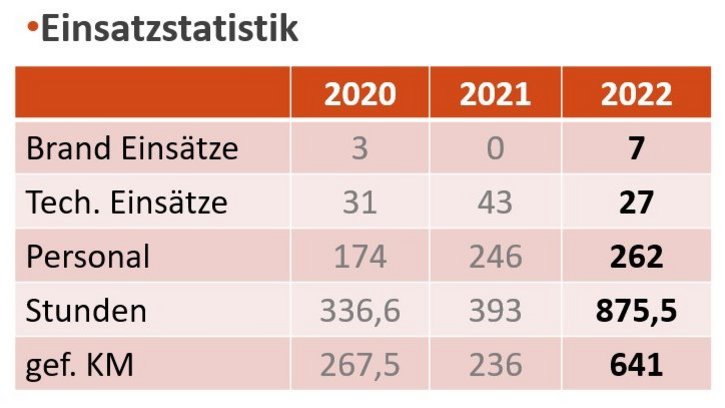 Es wurden im Jahr 2022 sieben Brandeinsätze und 27 technische Einsätze bewältigt. Insgesamt wurden ca. 11.880 freiwillige und unentgeltliche Stunden von den Kameraden aufgeopfert, um die weit über die St. Willibalder Gemeindegrenzen hinaus bekannte Schlagkraft aufrecht zu erhalten.